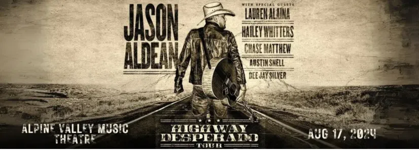 Jason Aldean brings his Highway Desperato tour to Alpine Valley Music Theatre in Elkhorn, Wisconsin, on Saturday, August 17 at 7:30 pm.